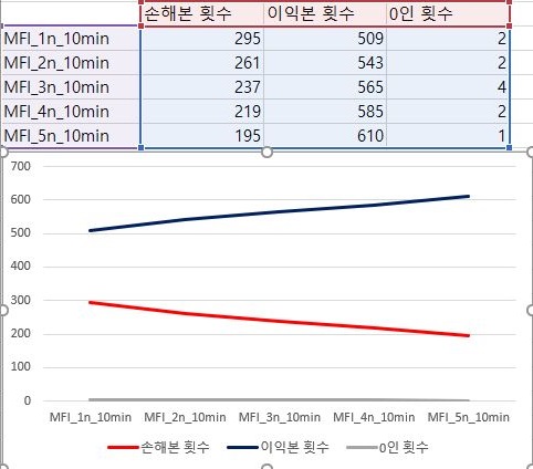 마지막으로 한번 이익과 손해의 총합을 각각 구해서 비교하는 그래프를 그려 보았더니, 조건이 더 빡빡해 지면 질수록 어째서 이익의 합계는 줄어들고, 손해의 합계는 늘어나는 이 경향을 계속해서 보여주고 있습니다. 이래서야 이걸 가장 널널한 조건에서 10분봉 캔들챠트 데이터 베이스로 사용할 수 밖에 없겠다는 생각이 듭니다.