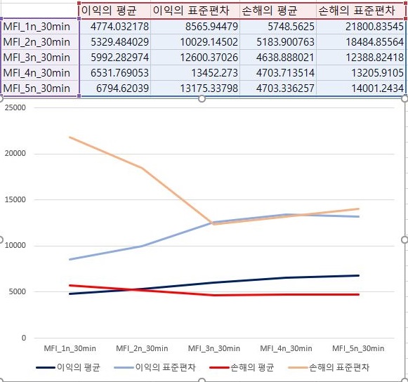 그리고 나서 이익과 손해의 합계에 대해서 한번 따져 보도록 합니다. 일단 여기서는 조건이 빡빡한 조건으로 가면 갈수록 이익의 합계는 내려가고, 손해의 합계는 증가하는 크로스가 나오는 것을 볼 수 있습니다. 이렇게 해서 30분봉 캔들챠트 데이터 베이스까지는 확인을 할 수 있었으며, 이제 남아 있는 60분봉 캔들챠트 데이터 베이스를 다음 포스팅에서 다룰 것을 약속드리며 이만 마치도록 하겠습니다.