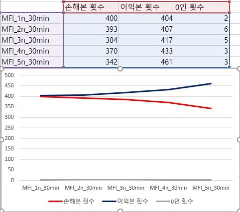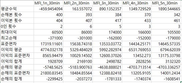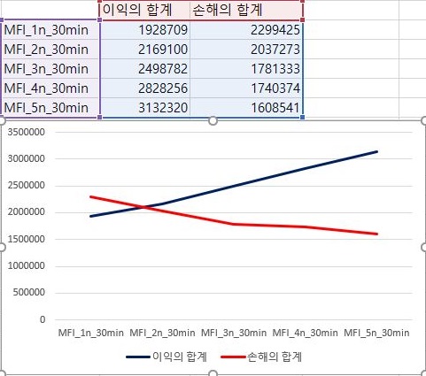 그리고 나서 이익과 손해의 합계에 대해서 한번 따져 보도록 합니다. 일단 여기서는 조건이 빡빡한 조건으로 가면 갈수록 이익의 합계는 내려가고, 손해의 합계는 증가하는 크로스가 나오는 것을 볼 수 있습니다. 이렇게 해서 30분봉 캔들챠트 데이터 베이스까지는 확인을 할 수 있었으며, 이제 남아 있는 60분봉 캔들챠트 데이터 베이스를 다음 포스팅에서 다룰 것을 약속드리며 이만 마치도록 하겠습니다.