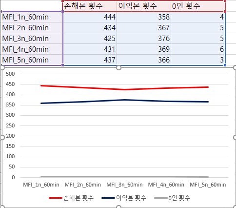 그리고 나서 다음으로는 이익과 손해만을 따로 모아서 평균과 표준편차를 만들어 내었습니다. 이렇게 해서 나왔는 결과를 가지고 보니, 여기서도 그렇게 큰 변동이 있다는 생각이 들지 않습니다.