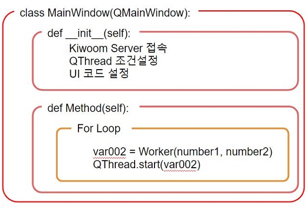 그리고 이 클래스들은 크게 어떤 역할을 하는지에 대해서 설명을 하자면, 일단 파란색 테두리의 Worker라는 클래스 보다는 빨간색 테투리의 MainWindow라는 클래스에 대해서 설명을 먼저 해야 합니다. 우선 여기서는 키움증권 서버에 접속을 명령하고, 그 다음에 QThread라는 이 PyQt에서 사용할 수 있는 Multithreading기술을 사용할 준비를 해 줍니다. 그리고 나서 각각의 쓰레드가 되는 Worker라는 클래스를 출발시킵니다.