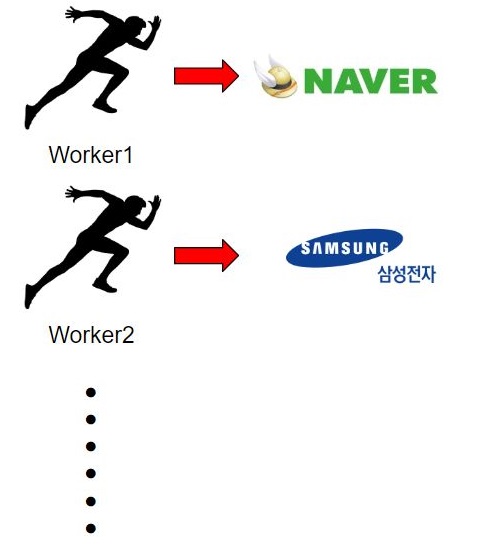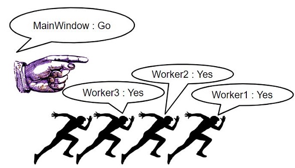 간단하게 그림으로 설명을 하자면, 위에서 지시를 내리는 클래스가 바로 MainWindow라는 클래스고, 여기서 가라고 명령을 하면, 각각의 쓰레드라고 주자가 되는 Worker라는 클래스가 여러개의 객체가 되면서 출발을 하게 됩니다. 이렇게 출발한 쓰레드는 무슨 역할을 하느냐 하면..........