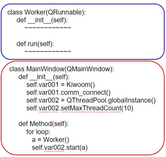 그리고 이 클래스들은 크게 어떤 역할을 하는지에 대해서 설명을 하자면, 일단 파란색 테두리의 Worker라는 클래스 보다는 빨간색 테투리의 MainWindow라는 클래스에 대해서 설명을 먼저 해야 합니다. 우선 여기서는 키움증권 서버에 접속을 명령하고, 그 다음에 QThread라는 이 PyQt에서 사용할 수 있는 Multithreading기술을 사용할 준비를 해 줍니다. 그리고 나서 각각의 쓰레드가 되는 Worker라는 클래스를 출발시킵니다.