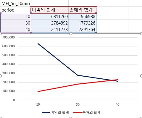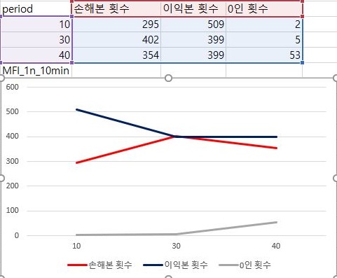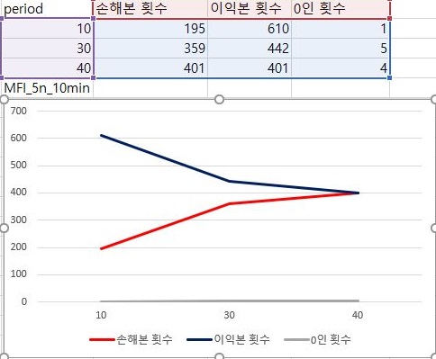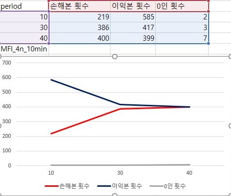 마지막으로 가장 빡빡한 조건에서 한번 테스트를 해 보았더니, 여기서는 일단 경향 자체는 비슷한데, 문제는 거래량이 아예 없는 종목이 늘어난 탓인지 손해를 보는 종목의 갯수는 마지막 40period에서는 오히려 감소하는 것을 볼 수 있습니다. 이렇게 해서 일단 MFI의 지수까지 보는 것은 끝이 났고, 다음 포스팅부터 드디어 매도/매수 룰을 정하기 위한 작업에 들어가 보고자 합니다.