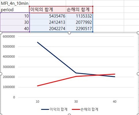 그리고 나서 가장 널널한 조건에서 한번 이익과 손해의 합계를 구해보니, 여기서는 일단 period가 커지면 커질수록 이익의 총합계는 급격히 줄어들고, 그 보다는 완만하지만, 손해의 합계는 크게 증가하는 경향이 있다는 것을 알 수 있었습니다.
