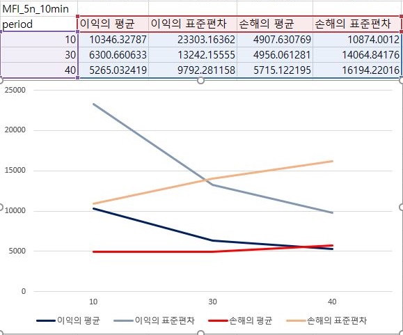그리고 나서 가장 빡빡한 조건에서 한번 이익과 손해의 평균과 표준편차를 비교해 보도록 합니다. 일단 10 period에서는 이익의 평균은 손해의 평균보다 훨씬 크지만, 그 이후에는 역전이 되는 것을 확인할 수 있습니다.