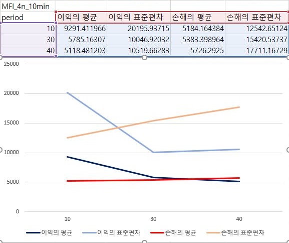 마지막으로 가장 빡빡한 조건에서 한번 테스트를 해 보았더니, 여기서는 일단 경향 자체는 비슷한데, 문제는 거래량이 아예 없는 종목이 늘어난 탓인지 손해를 보는 종목의 갯수는 마지막 40period에서는 오히려 감소하는 것을 볼 수 있습니다. 이렇게 해서 일단 MFI의 지수까지 보는 것은 끝이 났고, 다음 포스팅부터 드디어 매도/매수 룰을 정하기 위한 작업에 들어가 보고자 합니다.