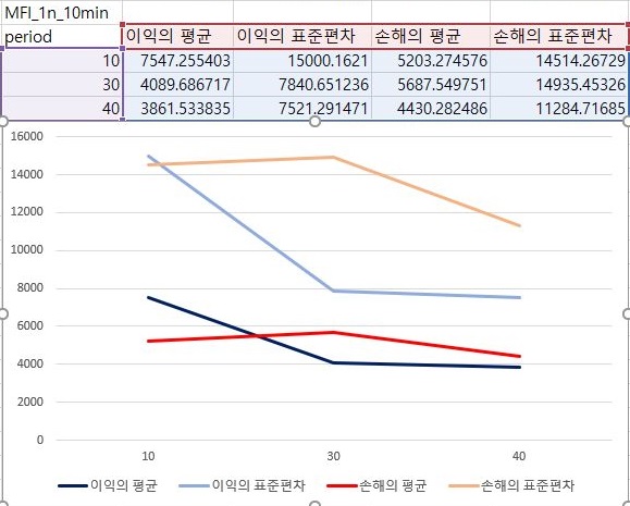 그리고 나서 가장 빡빡한 조건에서 한번 이익과 손해의 평균과 표준편차를 비교해 보도록 합니다. 일단 10 period에서는 이익의 평균은 손해의 평균보다 훨씬 크지만, 그 이후에는 역전이 되는 것을 확인할 수 있습니다.