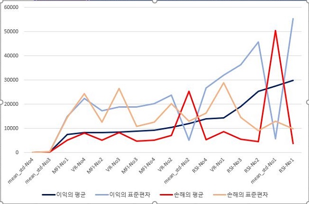 먼저 이익과 손해의 평균과 표준편차에 대해서 한번 그래프를 그려 보았습니다. 일단 두번째로 이익의 평균이 크게 나온 종목이 이상할 정도로 손해의 평균이 커서 걱정이 되기는 하지만, 일단 순서를 세우는 데는 성공했습니다.