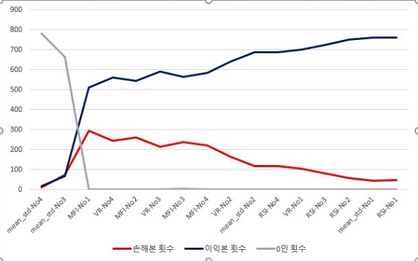 여기서는 이익본 횟수와 손해본 종목의 갯수에 대해서 한번 비교를 하는 그래프를 그렸는데, 일단 이동평균선 2번 조건까지는 그런대로 손해를 보는 종목의 갯수가 낮게 유지가 되는 것을 볼 수 있었습니다. 그리고 나서 다음으로 볼 수 있는 것으로는 이익 역시 이동평균선 2번 조건까지는 그런대로 높게 유지가 되는 것을 볼 수 있습니다.