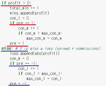 이렇게 해서 차익이 발생하면, 이게 양수냐, 아니면 0 내지는 음수-손해가 발생하였느냐에 따럿 연속적인 이익 혹은 손해라는 것을 계산하는 방법도 구현을 해 놓았습니다.