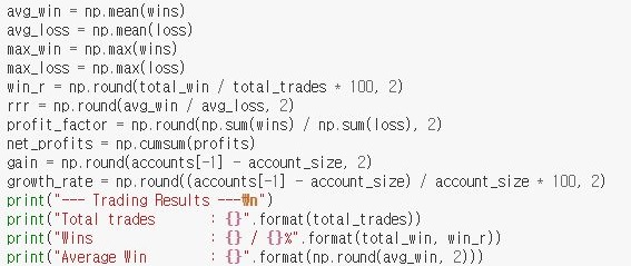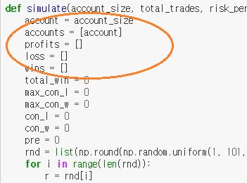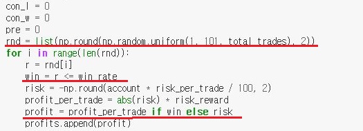 그리고 나서 먼저 중요한 것이 이 사람의 경우에는 주식 캔들챠트 데이터를 가지고 작업을 한 것이 아니라 순전히 랜덤 상수를 생성해서 그냥 승률이 얼마라고 해서, 어느정도 비율로 이익을 내는 경우에 차익이 발생하면 그걸 list에 하나하나 집어넣는 방법을 썼습니다. 이 부분을 저는 2개 이상의 스크립트를 작성해서 어떻게 제 매도/매수 룰을 작성해서 사용해야 합니다.