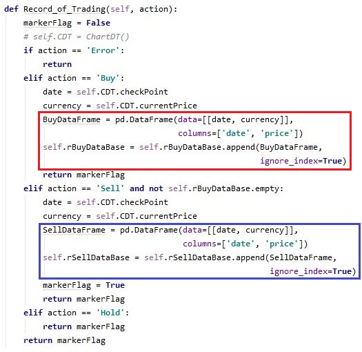 그리고 나서 다른 py파일에 가서, 매수와 매도의 가격을 따로따로 기록을 하는지 안 하는지를 한번 보도록 했습니다. 일단 여기서는 pandas의 데이터 프레임을 생성해서 날짜까지 기록을 하고 있는 것을 확인할 수 있었습니다.