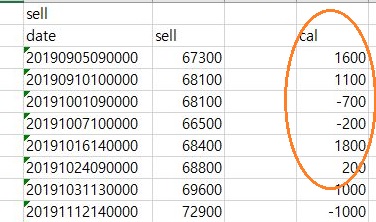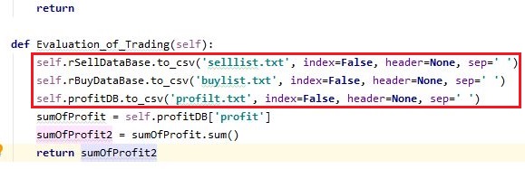그리고 나서 다음으로 계산한 것은, 일단 이 이익과 매수/매도 상황을 txt파일로 가지고 올 수 있는지 알아보기 위해서 pandas의 dataframe에서 to_csv()함수를 이용해서 가지고 올 수 있었습니다. 여기서 index= 는 False로 두도록 하고, header=는 None 그리고 가장 중요한 sep=는 어떻게 해서 데이터와 데이터를 구분할 것인지를 나타내는데, 제 경우에는 그냥 공백으로 띄우는 식으로 했습니다.