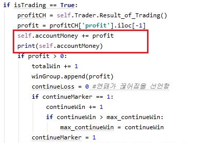 그리고 나서 위 스크린샷에서 볼 수 있는 것처럼 일단 초기 자본금 - 정확히는 계좌의 현금에다가 이익을 더하기 해서 작업이 진행이 되는지 여부를 알아 보도록 합니다.