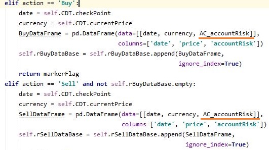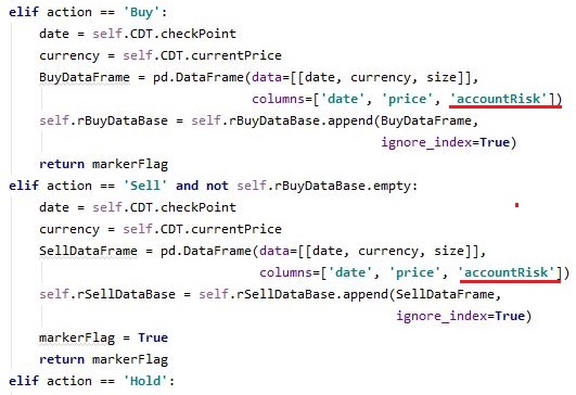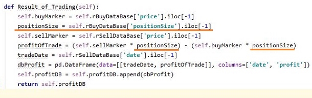 그리고 나서 다음으로 이 position size를 계산한 다음에 구매를 할 때 dataframe안에 넣어 주도록 했습니다. 이제 매도를 해서 계산을 해야 하는 순간이 오면, 위 스크린샷에서 볼 수 있는 것처럼 일단 지정을 해서 이제 profit을 계산하는 단계에서 반영을 해 주도록 합니다.