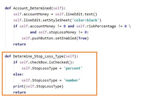그리고 여기서 나오는 메서드에서 위 스크린샷에서 볼 수 있는 것처럼 코드를 짜서, 체크가 되어 있는 상태라면 퍼센트로 손절매할 가격을 정한다고 하고, 아니라면 숫자로 지정한다고 일단 올려 보도록 합니다.