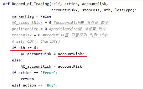 그리고 나서 다음으로 볼 수 있는 것으로는 일단 nth가 6 이상이면 변동이 되는 account risk2를 이용해서 position size를 결정하고, 그 미만이라면 고정된 account risk를 이용, 어떻게 해서 position size를 계산하도록 합니다.