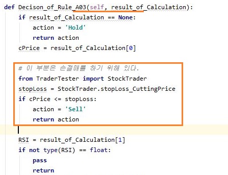 먼저 결정을 하는 메서드에서 손절매를 하기 위한 코드를 가지고 오도록 합니다. 이전에는 그냥 구현만 했는 이 코드를 하나하나 결정을 하는 메서드에 집어넣어 주도록 하고, 여기다가 주석처리를 해서 잊지 말도록 합니다.