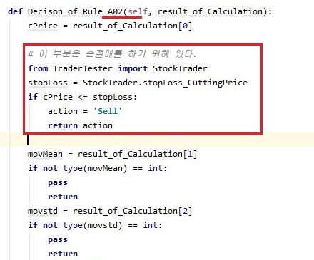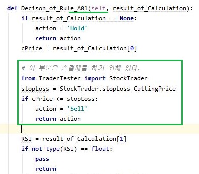 먼저 결정을 하는 메서드에서 손절매를 하기 위한 코드를 가지고 오도록 합니다. 이전에는 그냥 구현만 했는 이 코드를 하나하나 결정을 하는 메서드에 집어넣어 주도록 하고, 여기다가 주석처리를 해서 잊지 말도록 합니다.