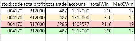 일단 이렇게 해서 우선 계좌에 대해서는 제대로 결과가 나오는 것을 확인할 수 있기는 있었습니다. 다음으로는 손절매를 비롯한 횟수가 제대로 나오는 가 여부 입니다.