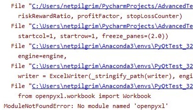 그리고 나서 작업을 시작해 보니까, 위 스클니샷에서 볼 수 있는 것처럼 어째서 인지 openpyxl이라는 모듈이 없어서 생기는 문제라고 할 수 있습니다.