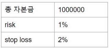 먼저 한개의 종목당 100만원씩 넣어 주도록 했으며, 다음으로 해야 하는 것으로는 일단 리스크는 1%로 주도록 했으며 stop loss는 2%로 주도록 했습니다.