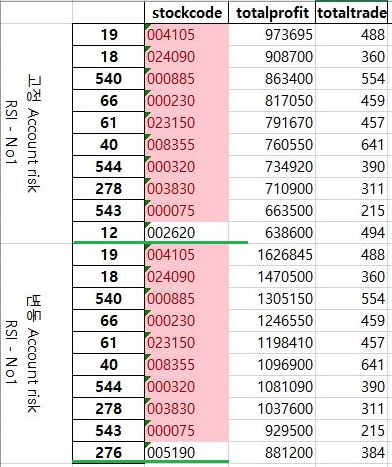 먼저 일단 하나하난 조건에 대해서 일단 데이터를 정리해 보았습니다. 여기서 수익이 나온 종목도 있고 없는 종목, 심지어는 마이너스가 된 종목도 볼 수 있었습니다.