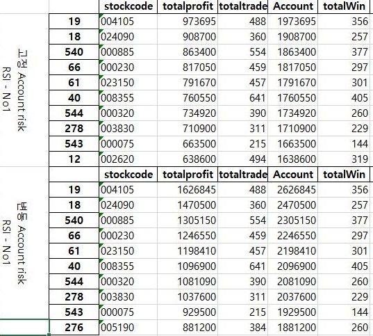 먼저 일단 하나하난 조건에 대해서 일단 데이터를 정리해 보았습니다. 여기서 수익이 나온 종목도 있고 없는 종목, 심지어는 마이너스가 된 종목도 볼 수 있었습니다.