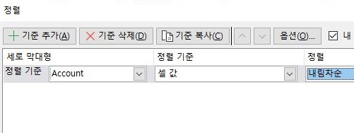 그리고나서 위 스크린샷에서 볼 수 있는 것과 같이 일단 계좌를 중심으로 해서 내림차순으로 데이터 정렬 기능을 사용해서 일단 전체 데이터를 정렬해 보도록 합니다.