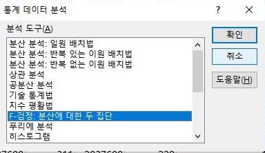 그리고 나서 F검정이라는 것을 먼저 선택하도록 합니다. 아직 제가 통계에 대해서 잘 모르기는 하지만, 들은 바로는 이게 두 상관관계 없는 집단의 분산이 등분산을 따르는지 아닌지를 알아보는 테스트라고 합니다.