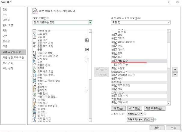 먼저 엑셀의 옵션 메뉴를 불러와서, 여기서 있는 개발도구를 체크표시를 하고서 일단 확인을 눌러 주도록 합니다. 이렇게 하면............