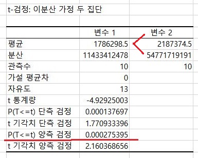 이렇게 해서 결과가 나왔습니다. 일단 여기서 헷갈리면 안되는 것이 P단측검정을 2배해서 나온 값이 0.05보다 크면 등분산이 성립한다는 것이고, 아니면 등분산이 아니다 = 즉 미만일 경우에는 아니라고 할 수 있는 것 입니다.