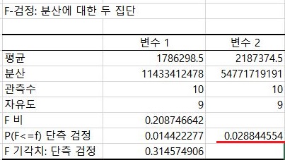 이렇게 해서 결과가 나왔습니다. 일단 여기서 헷갈리면 안되는 것이 P단측검정을 2배해서 나온 값이 0.05보다 크면 등분산이 성립한다는 것이고, 아니면 등분산이 아니다 = 즉 미만일 경우에는 아니라고 할 수 있는 것 입니다.