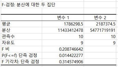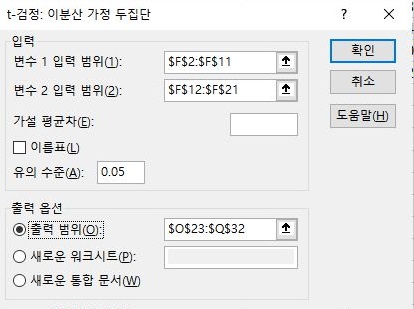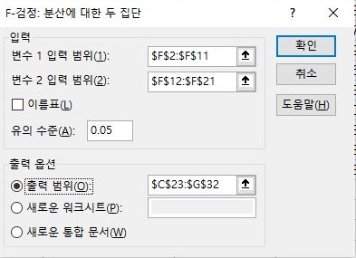 그리고 나서 F검정이라는 것을 먼저 선택하도록 합니다. 아직 제가 통계에 대해서 잘 모르기는 하지만, 들은 바로는 이게 두 상관관계 없는 집단의 분산이 등분산을 따르는지 아닌지를 알아보는 테스트라고 합니다.