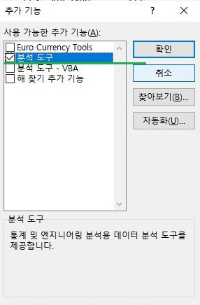 추가기능을 선택해서 여기서 분석도구라는 항목을 일단 그대로 가져 오도록 합니다. 이렇게 해서 가지고 왔으면, 이제 다음 작업에 들어갈 수 있게 됩니다.