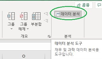 데이터 항목에 들어가게 되면, 기존에는 없었는 데이터 분석이라는 도구가 새로 생기게 되는데, 여기서 통계처리를 할 수 있도록 도와주는 기능이 있습니다.