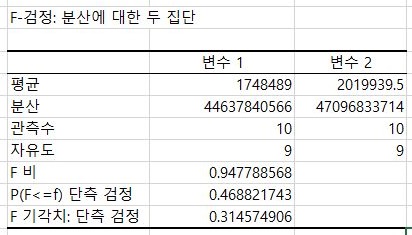 그리고 나서 2배를 곱한 P 값의 양측검정 값을 보면, 0.05를 넘어가서 여기서는 등분산이 성립한다는 것을 확인할 수 있었습니다.