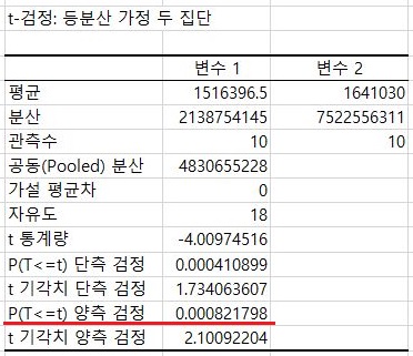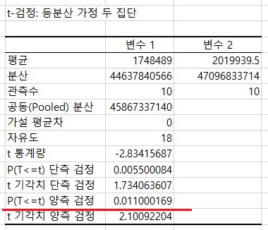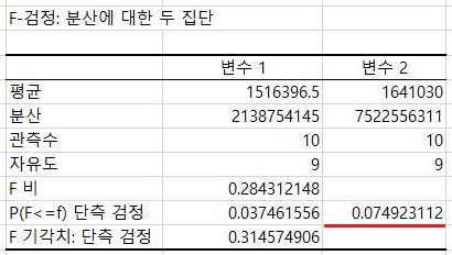 그리고 나서 2배를 곱한 P 값의 양측검정 값을 보면, 0.05를 넘어가서 여기서는 등분산이 성립한다는 것을 확인할 수 있었습니다.