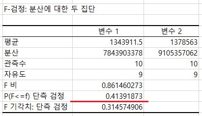 그리고 나서 다음으로 할 수 있는 것으로는 일단, 위 스크린샷에서 볼 수 있는 것과 같이 일단 F 검정 결과 두 집단은 등분산이 성립한다는 것을 알 수 있습니다. 정말 헷갈리기 쉬운 것이지만, 그냥 F 검정에서 유의수준 이상으로 나오면 등분산이 성립한다는 것을 그저 외우는 수 밖에는 없어 보입니다.