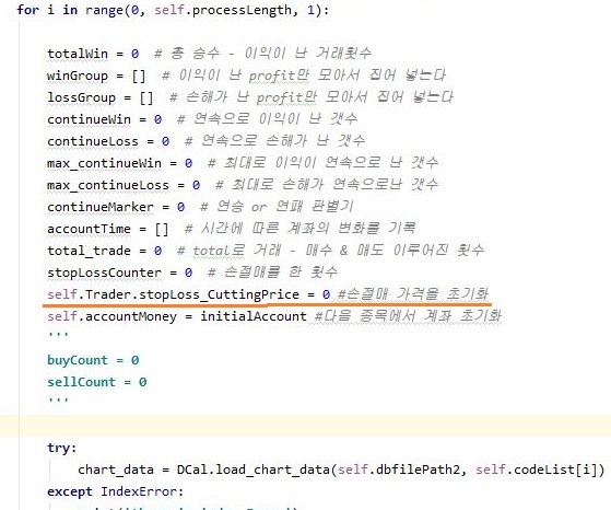 그렇게 하고 나서도 위 스크린샷에서 볼 수 있는 것처럼 계속해서 손절매 결정만 나오는 것을 확인할 수 있었습니다. 이래서야 어디가 에러인지 모르겠습니다만, 일단 손절매를 위한 cutting price가 제대로 초기화가 되지 않아서 생기는 문제라고 할 수 있겠습니다.
