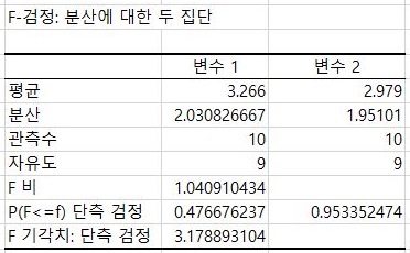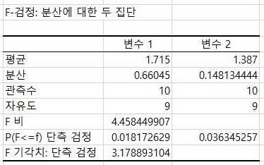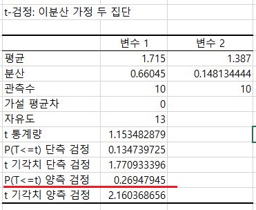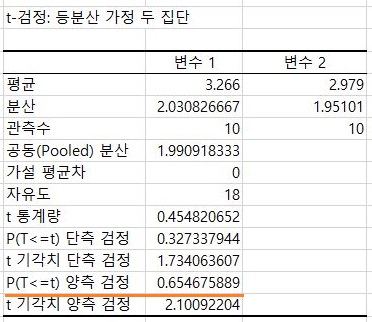 일단 F 검정을 한번 받아 보았더니, 여기서는 어떻게 등분산이 성립한다는 것으로 알 수 있었습니다. 이제 이 경우의 T 검정을 받아 보러 갑니다.