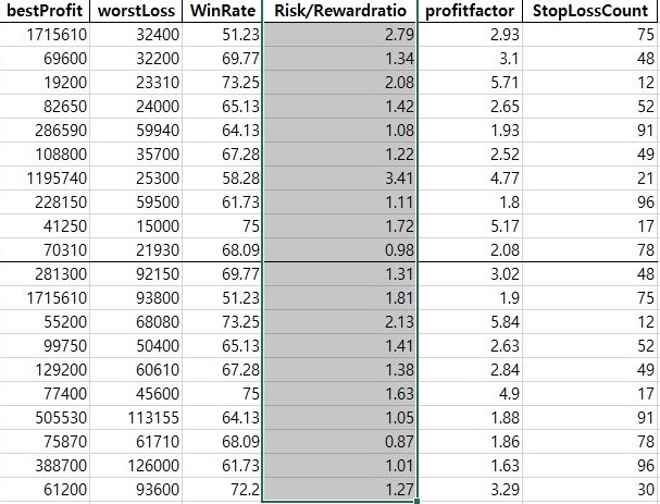 먼저 알아보기 위해서 우선은 Risk Reward Ratio라고해서 1원을 넣을 경우 얼마나 많은 돈을 얻을 수 있는지에 대해서 한번 알아보기 위한 수치를 가지고서 통계학적인 처리를 하고자 합니다.