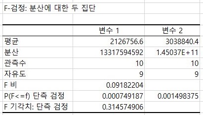 일단 F 검정을 한 결과를 보면, 여기서는 우선 위 스크린샷을 보면 알 수 있듯이 일단 등분산이 성립하도록 유의수준 0.05를 훨씬 넘어가는 것을 볼 수 있습니다.