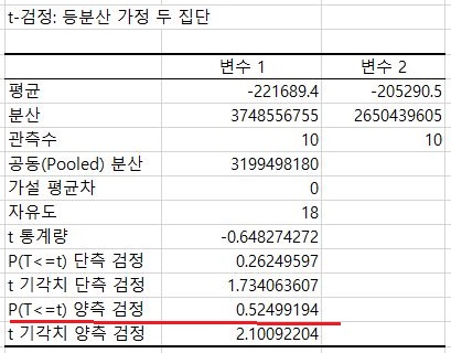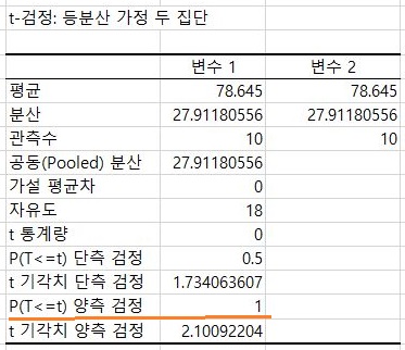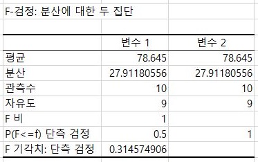 F검정 결과 아슬아슬한듯 한데, 일단 유의수준 0.05를 단측검정만 해도 10배나 넘겼고, 2배를 해주는 양측검정을 하면 확실하게 등분산이 성립하는 것을 알 수 있었습니다.