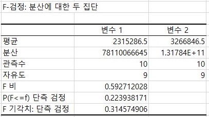 그리고 나서 다음으로 생각할 수 있는 것으로는 위 스크린샷에서 볼 수 있는 것처럼 일단 F 검정을 한번 보아서, 여기서 등분산이 성립하는 것을 확인할 수 있었습니다.