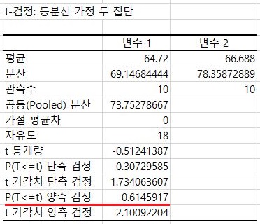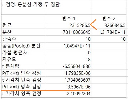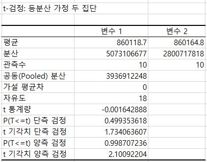 일단 F 검정 결과는 여기서 하나 알 수 있는 것으로는, 등분산이 성립하기 때문에 이를 가정한 T 검정을 받아야 한다는 것을 알 수 있었습니다.