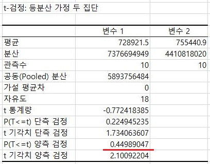 그리고 나서 한번 등분산을 가정한 T 검정을 가지고 보았더니, 여기서 볼 수 있는 것은 겨우겨우 유의수준을 넘어가서 유의수준이 없다는 결론을 낼 수 있었습니다.