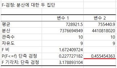 그리고 나서 양측검정을 한번 해 보았더니, 여기서 나오는 값을 가지고서 한번 알아보니, 0.05라는 유의수준을 양측 P 값에서 겨우 넘기는 것을 볼 수 있었습니다. 이래서 등분산이 성립하기는 한다는 것을 알 수 있었습니다.