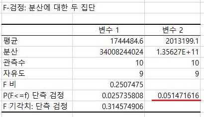 그리고 나서 양측검정을 한번 해 보았더니, 여기서 나오는 값을 가지고서 한번 알아보니, 0.05라는 유의수준을 양측 P 값에서 겨우 넘기는 것을 볼 수 있었습니다. 이래서 등분산이 성립하기는 한다는 것을 알 수 있었습니다.